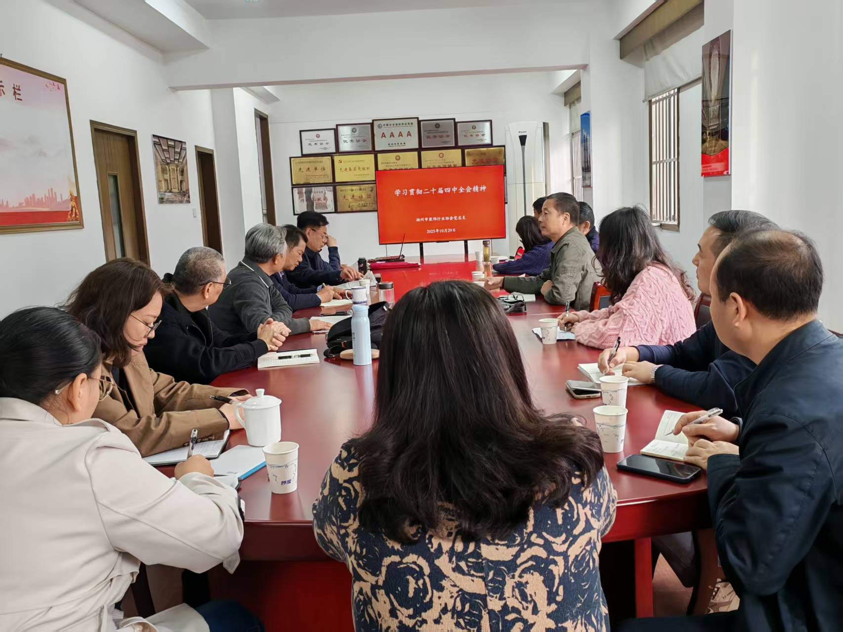 2025 年 10 月 29 日下午,扬州市装饰行业协会二楼会议室,协会党总支委员、各支部书记齐聚一堂,开展学习贯彻党的二十届四中全会精神的学习活动。