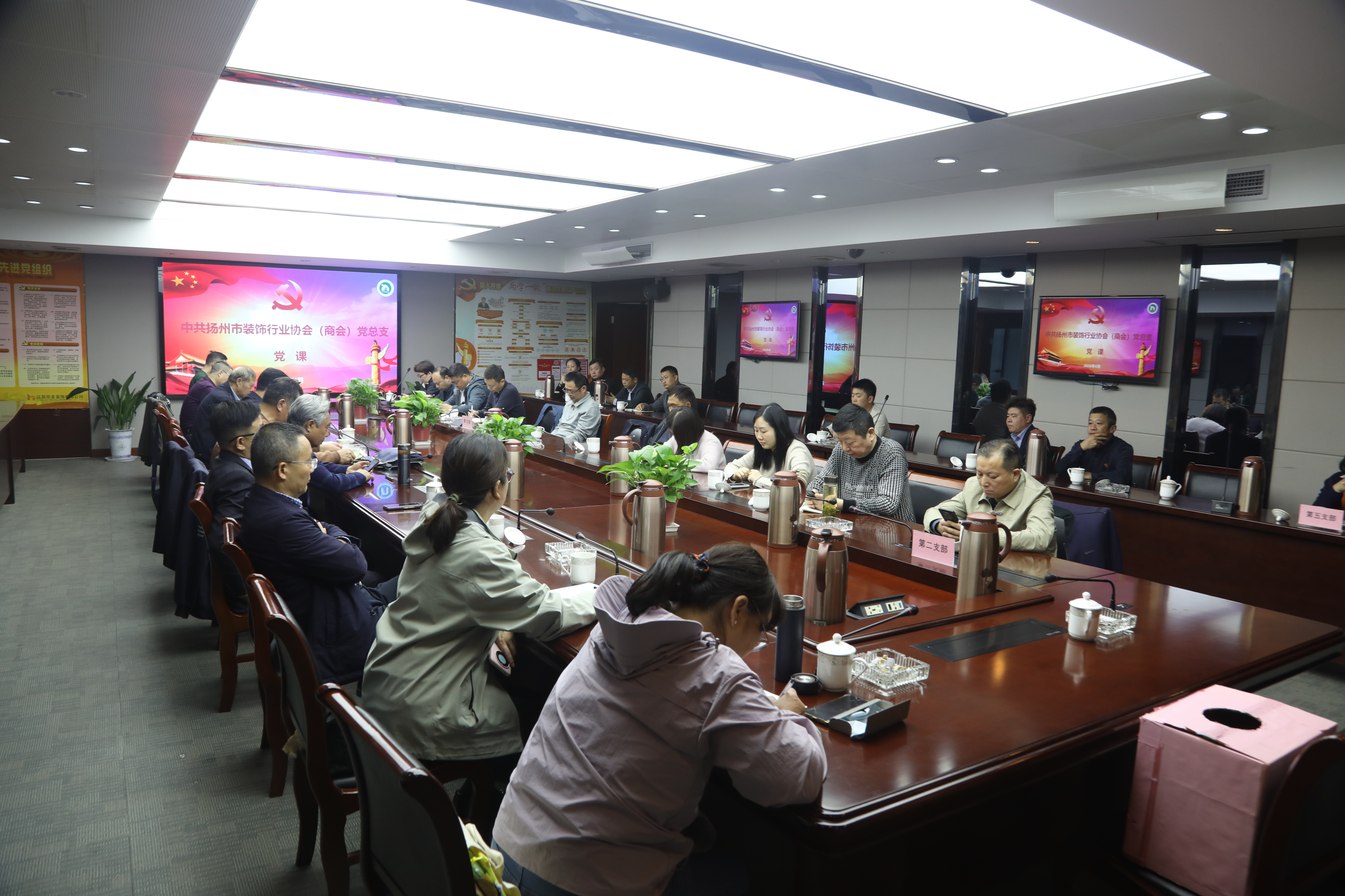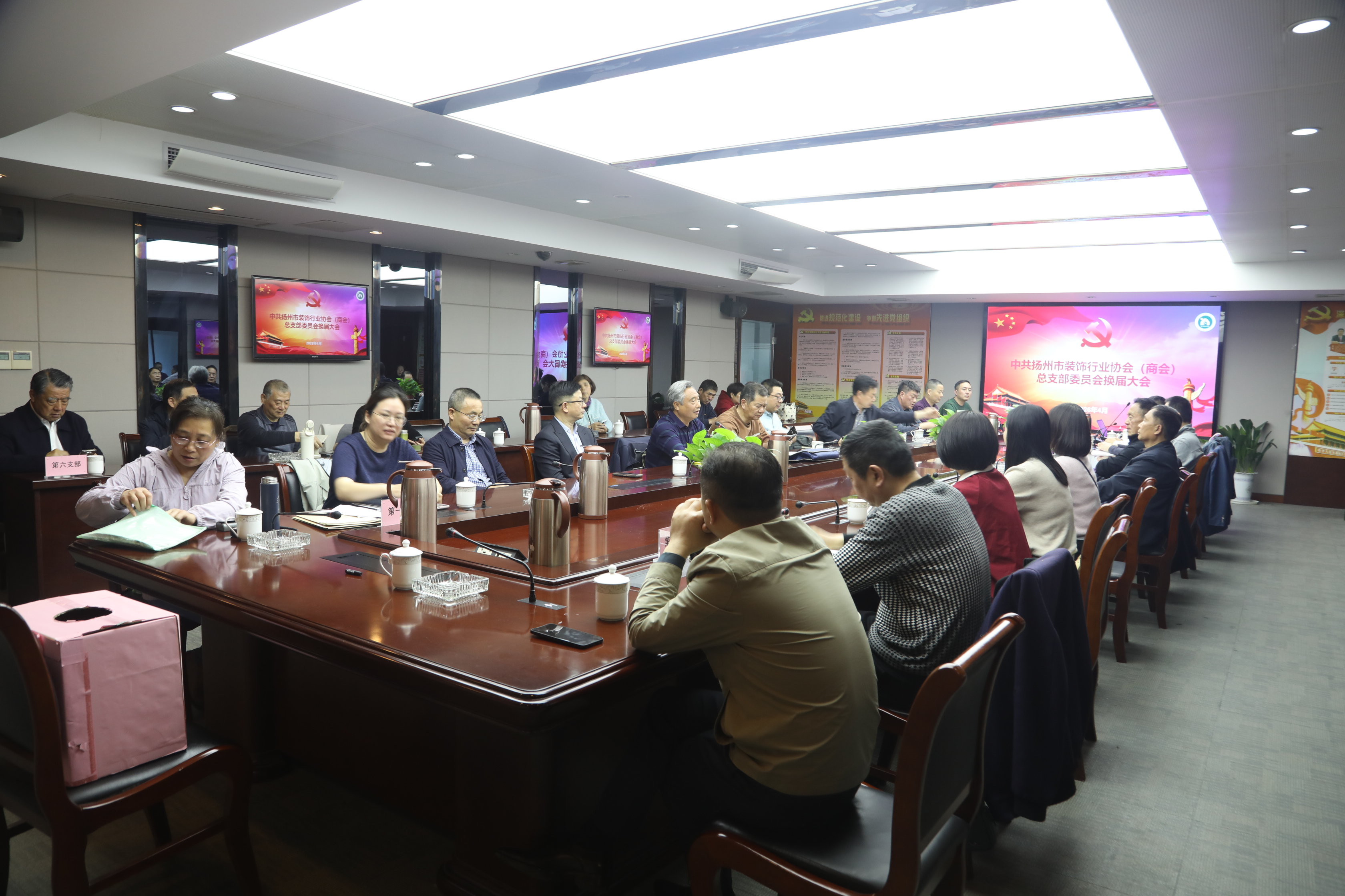 4 月 10 日下午,扬州市装饰行业协会(商会)总支部委员会换届大会在江苏华发装饰公司顺利召开。会议由第二届总支书记杨顺清同志主持。应到党员 38 人,实到党员 34 人,另有 1 名预备党员、2名发展对象和 3名积极分子出席了会议。